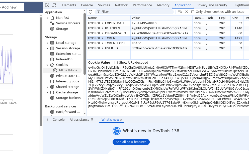 While it's possible to extract authorization tokens from cookies, these tokens are associated with user and SSO accounts and have a short lifetime. Authorization tokens with a 24-hour lifetime are inconvenient for programmatic usage. Consider service accounts instead. Beginning with release v5.4, Hydrolix supports flexible service account management tools.