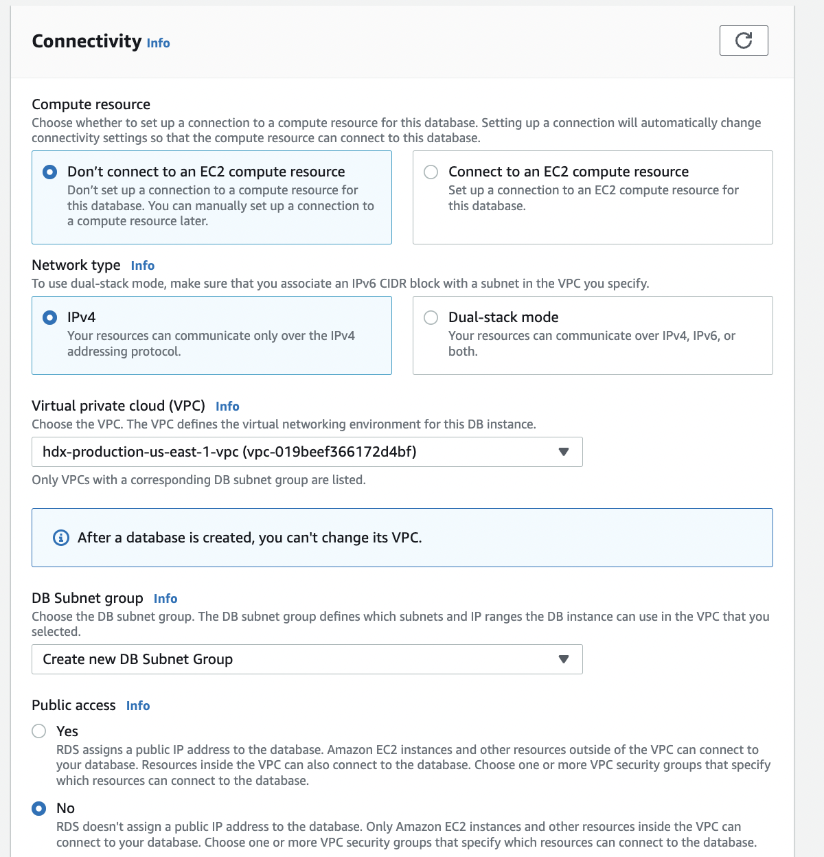 In the connectivity section, select the VPC ID associated with your EKS cluster. The dropdown lists all VPC in the region as: VPC Tag name (VPC ID). Select the default DB Subnet group.