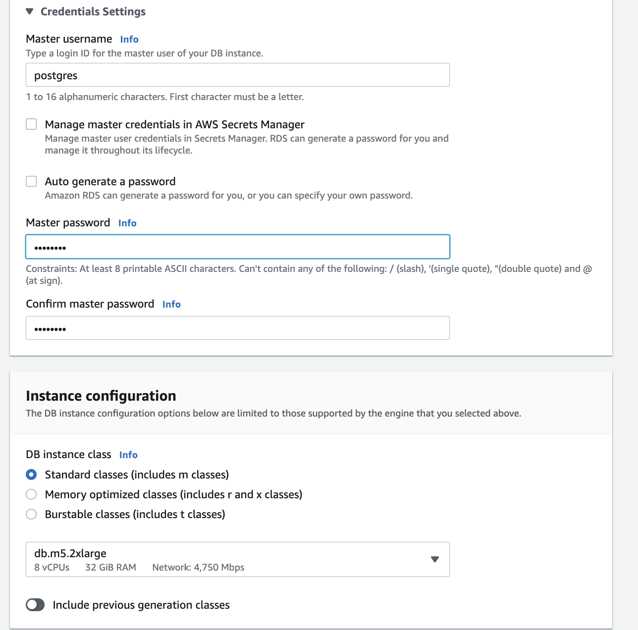 In the AWS console, switch to the RDS service and click create Database. Select PostgreSQL and Engine version 11.12-R1 or greater.