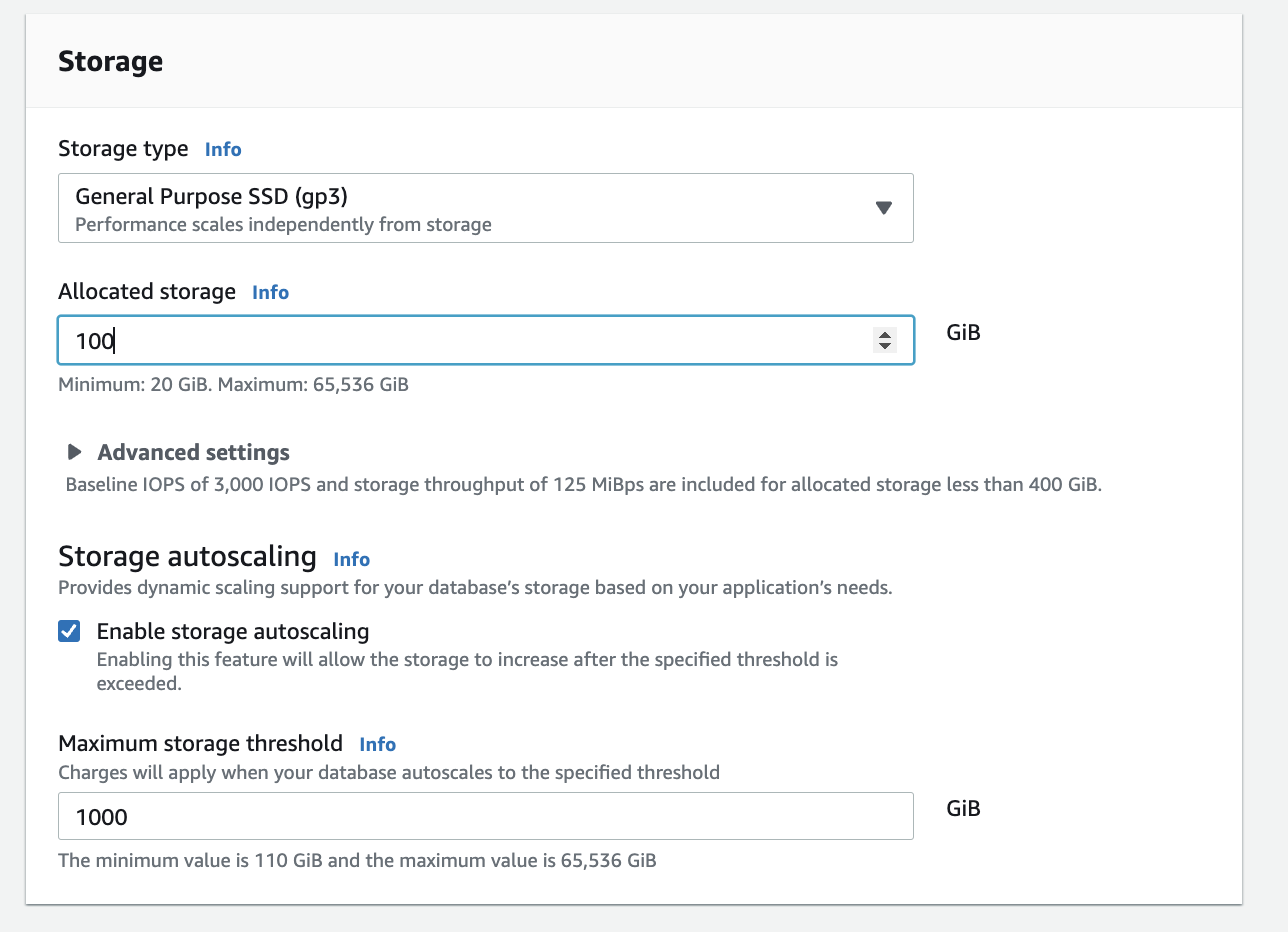 In the storage section, select the general purpose gp3 storage type with 100 GiB of allocated storage.