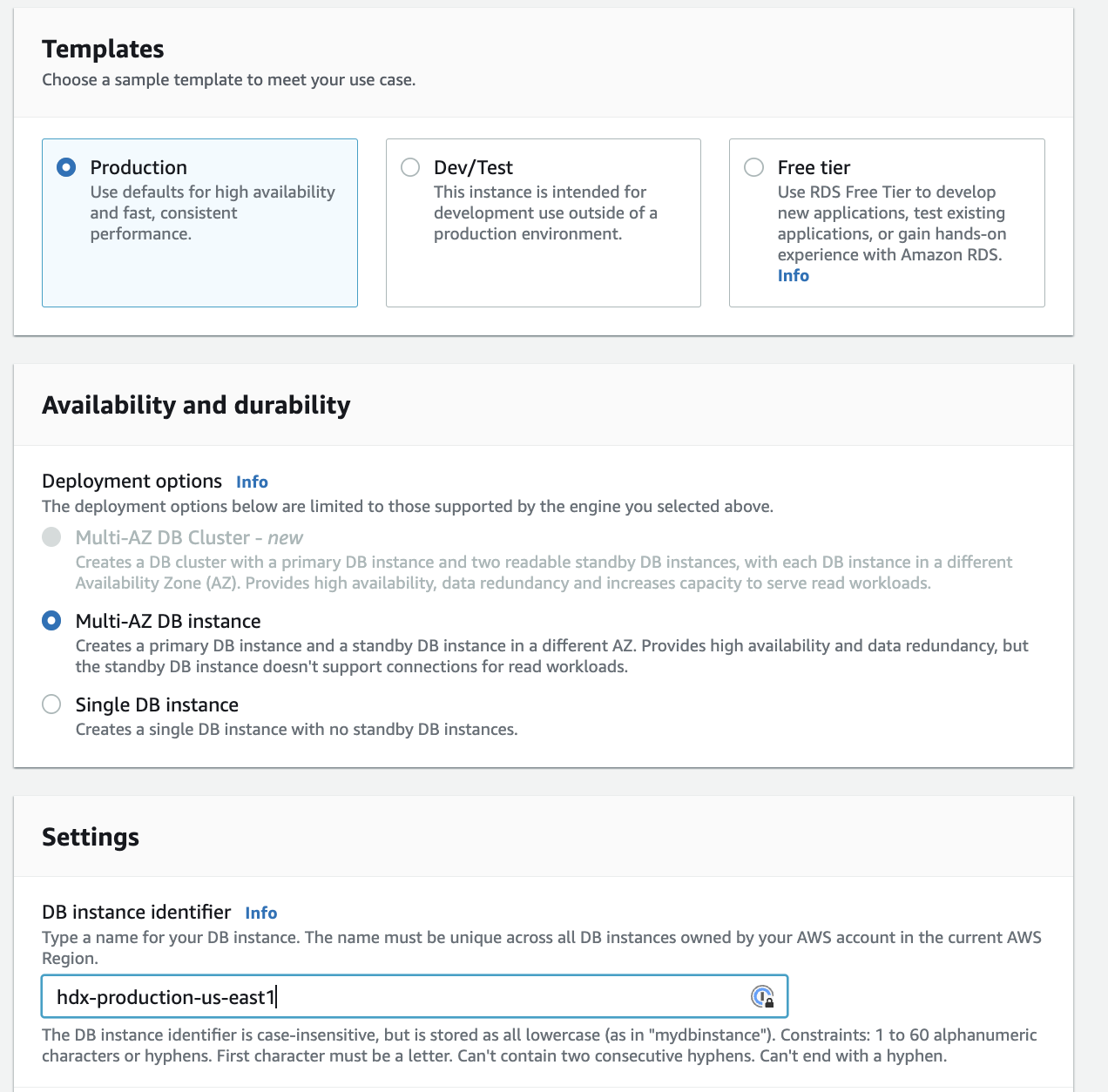Select the "Production" template. Choose the "Multi-AZ DB instance" availability and durability option. Enter a database name.