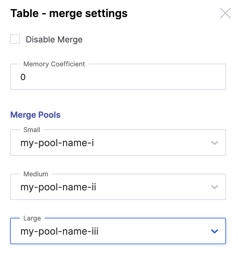 You can also configure this in the UI. Navigate to "Data", select the table to which you want to assign new pools, then find "Merge settings" under "Advanced options." You'll see this menu: