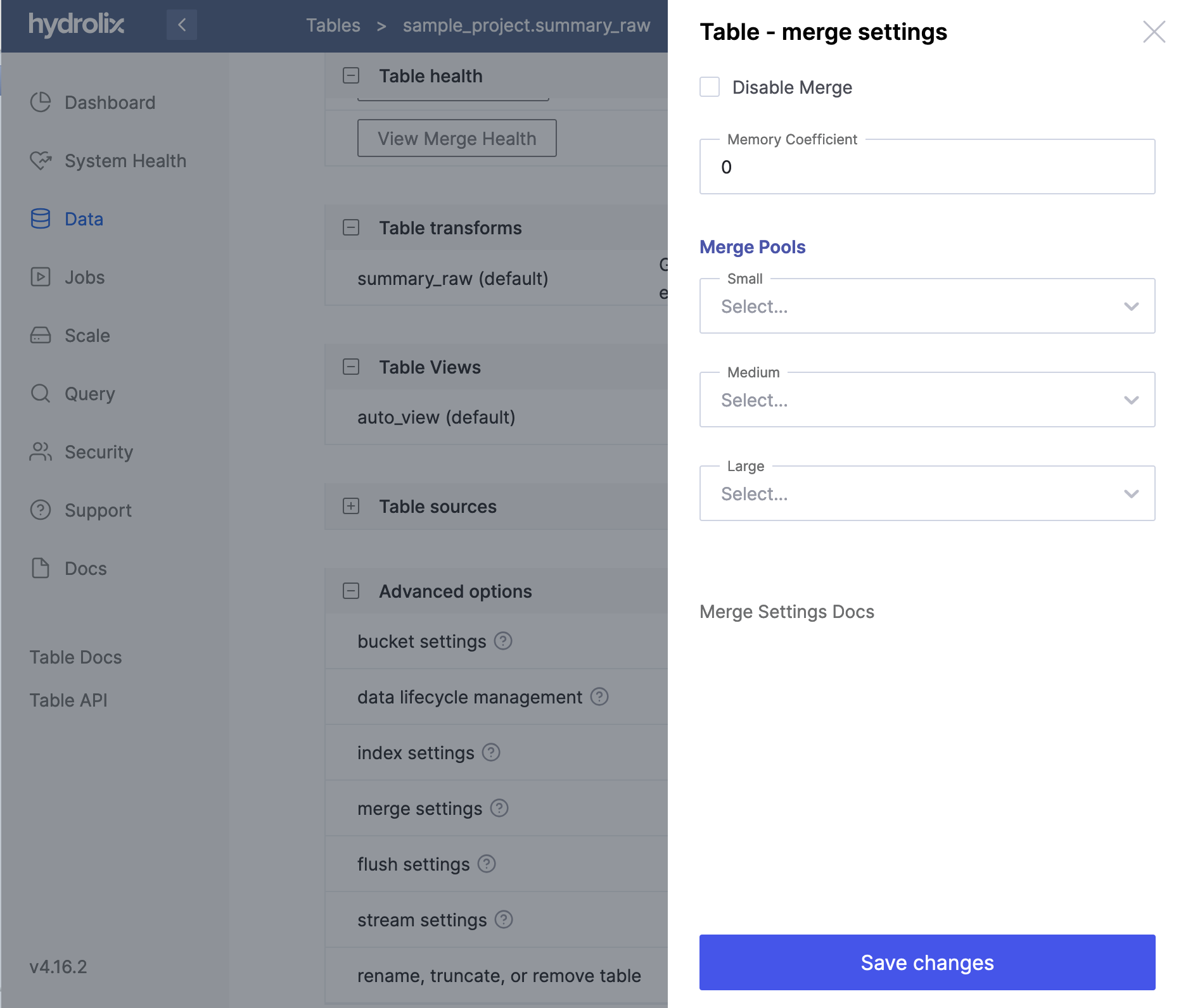 You can also disable merge for a given table through the web UI. Navigate to "Data," select the table you want, then find "merge settings" under “Advanced options” and click on the three dots in that row on the right. You can then select the "Disable Merge" checkbox from the menu.