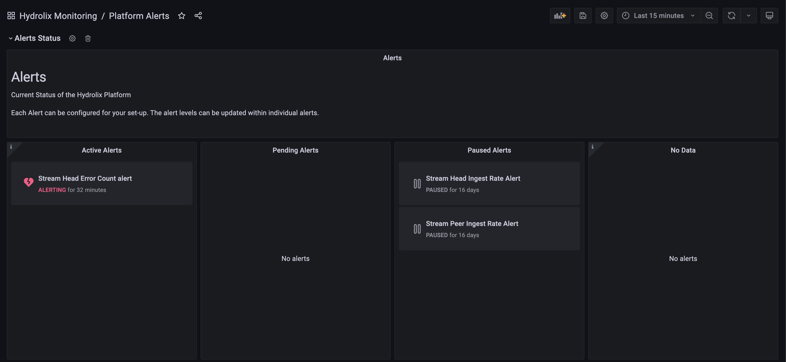 You can combine Hydrolix's built-in Prometheus component with Grafana to monitor your Hydrolix cluster. Your cluster comes with a default alert dashboard that you can customize to meet your specific needs.