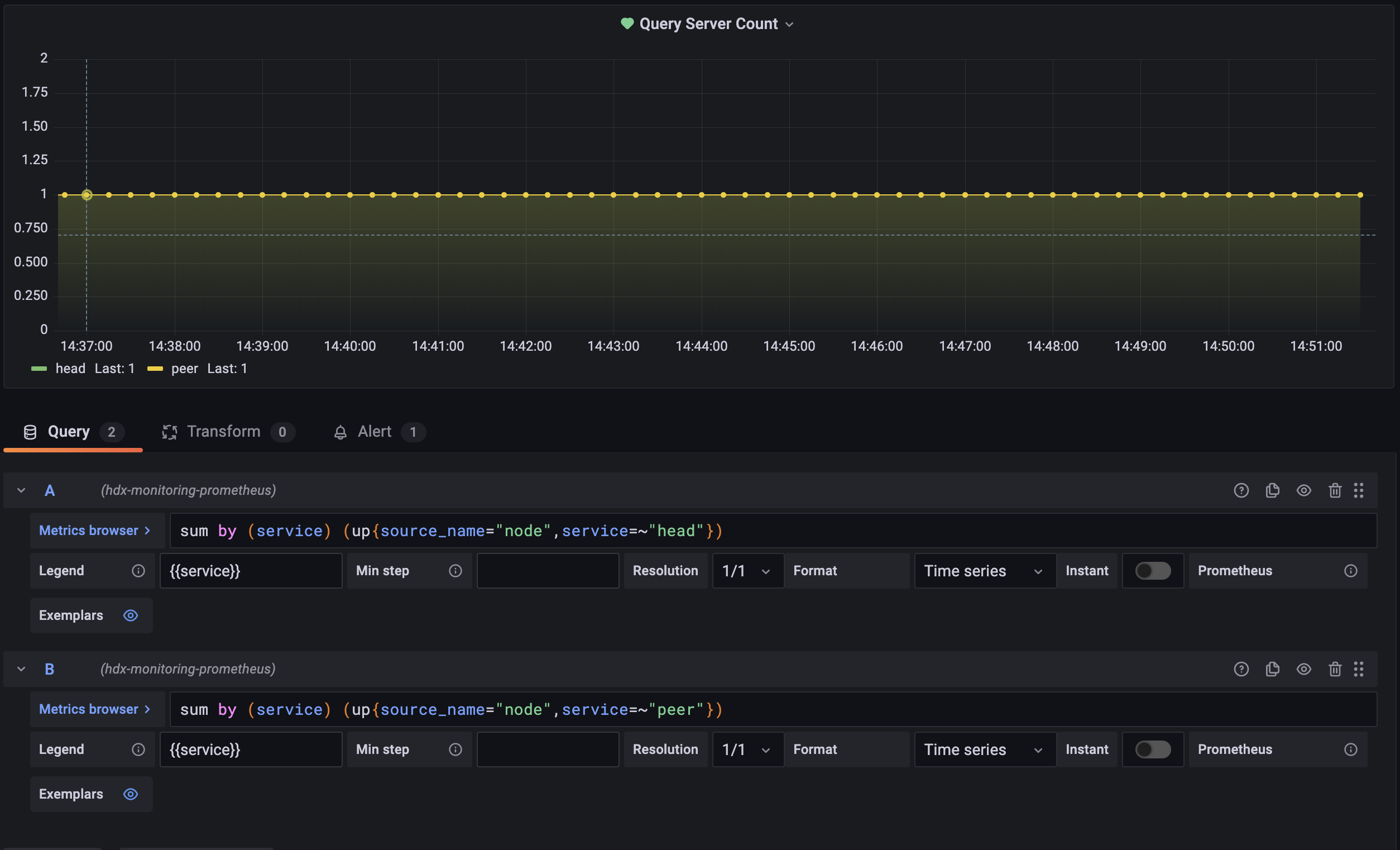 This chart monitors the number of running query heads and peers. You can write Grafana queries in PromQL. The following example aggregates over a named service to calculate a sum: