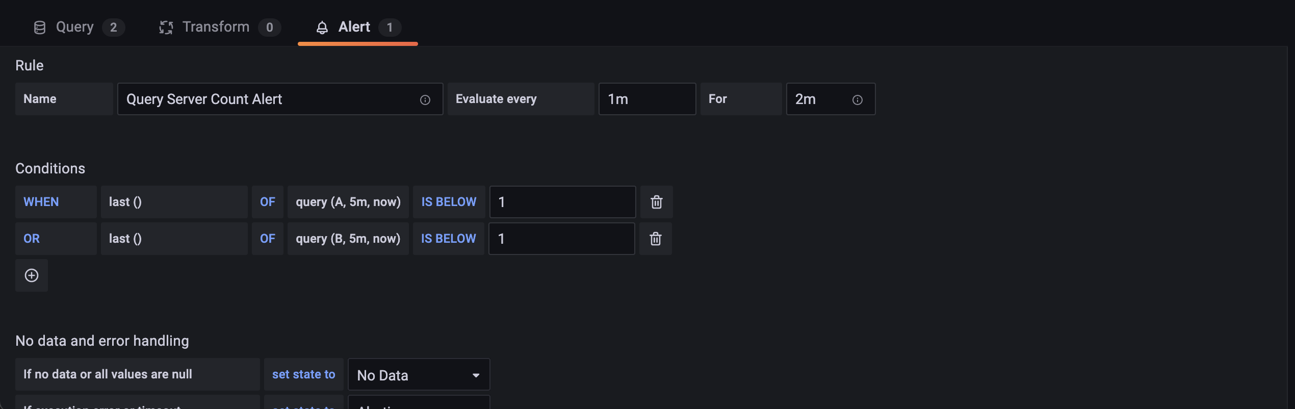This tab describes alert thresholds. The Rule defines the check frequency: every minute in this example. Conditions define the state we want to evaluate. If the condition evaluates to true, Grafana sends an alert. The following example checks if two queries (A, B) dropped below 1 in the last 5 minutes: